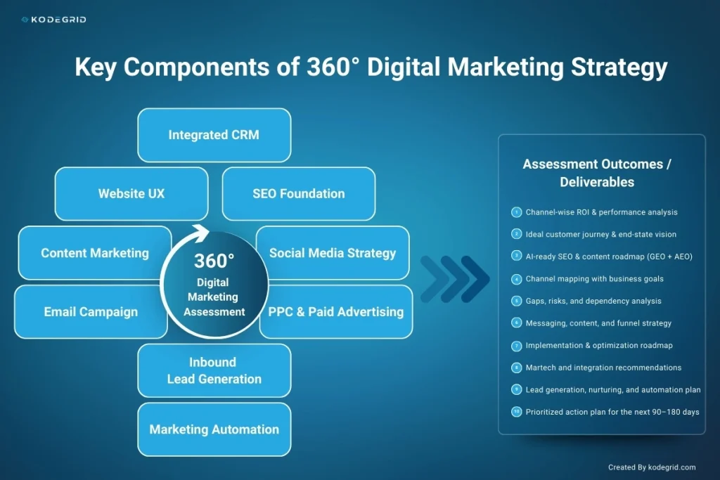 A 360-degree digital marketing strategy works by combining all major marketing channels into one connected system so customers get a consistent experience at every stage of their journey.